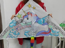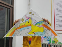 有的绘着彩蝶与“天天开心”的祝福,有的配以“快快乐乐”的祈愿,还有的用独角兽与彩虹承载童真幻想。这些风筝不再只是一张布,而是同学们用画笔写下的诗——有对日常的热爱,有对未来的期许,更有藏在色彩里的温柔心事。